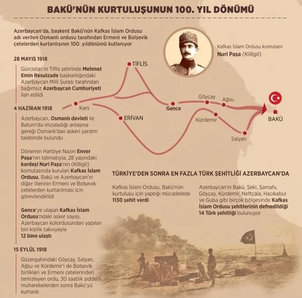 Cumhurbaşkanı Recep Tayyip Erdoğan, Kafkas İslam Ordusu'nun teşkilinin ve Bakü'nün kurtuluşunun 100. yıldönümü vesilesiyle düzenlenecek törenlere katılmak üzere yarın Azerbaycan'a resmi bir ziyaret gerçekleştirecek.