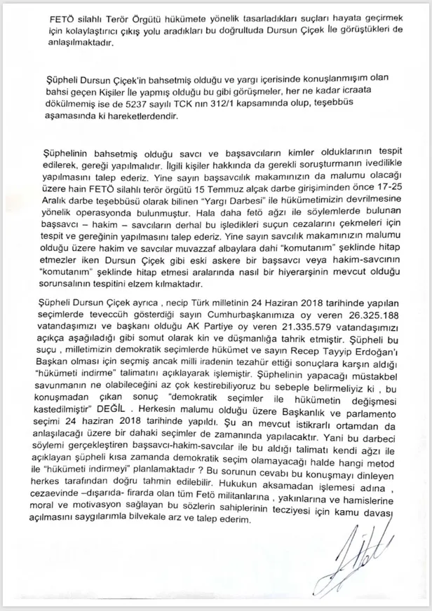 "FETÖ Silahlı Terör Örgütü hükümete yönelik tasarladıkları suçları hayata geçirmek için kolaylaştırıcı çıkış yolu aradıkları bu doğrultuda Dursun Çiçek İle görüştükleri de anlaşılmaktadır. Şüpheli Dursun Çiçek'in bahsetmiş olduğu ve yargı içerisinde konuşlanmış olan bahsi geçen kişiler İle yapmış olduğu bu gibi görüşmeler, her ne kadar icraata görüşme aşamasında kalmış ise de 5237 sayılı TCK'nın 312/1 kapsamında olup, teşebbüs aşamasında ki hazırlık hareketlerdendir."