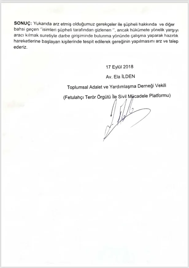 Toplumsal Adalet ve Yardımlaşma Derneği'nden avukat Ela İlden, Dursun Çiçek ve "isimleri şüpheli tarafından gizlenen" ancak hükümete yönelik yargıyı aracı kılmak suretiyle darbe girişiminde bulunma yönünde çalışma yaparak hazırlık hareketlerine başlayan kişilerinde tespit edilerek gereğinin yapılmasını istedi.