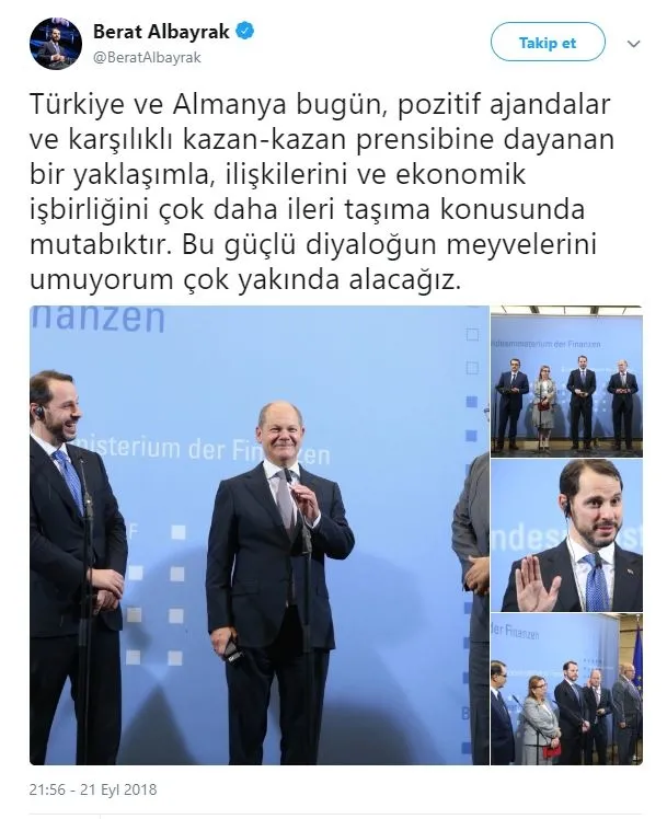Hazine ve Maliye Bakanı Berat Albayrak Almanya'daki temaslarının ardından resmi Twitter hesabı üzerinden açıklamalarda bulundu. Albayrak: "Türkiye ve Almanya bugün, pozitif ajandalar ve karşılıklı kazan-kazan prensibine dayanan bir yaklaşımla, ilişkilerini ve ekonomik işbirliğini çok daha ileri taşıma konusunda mutabıktır. Bu güçlü diyaloğun meyvelerini umuyorum çok yakında alacağız." dedi