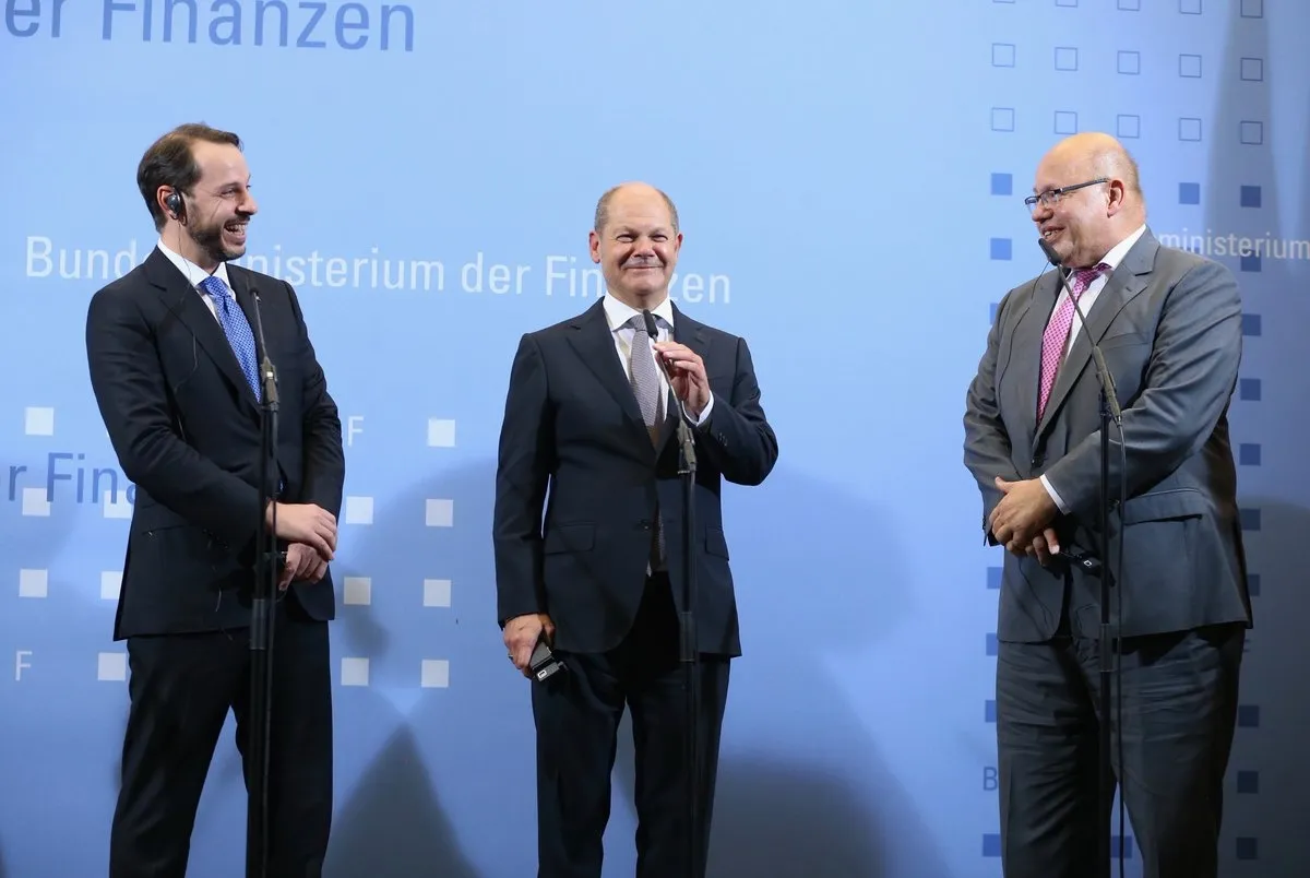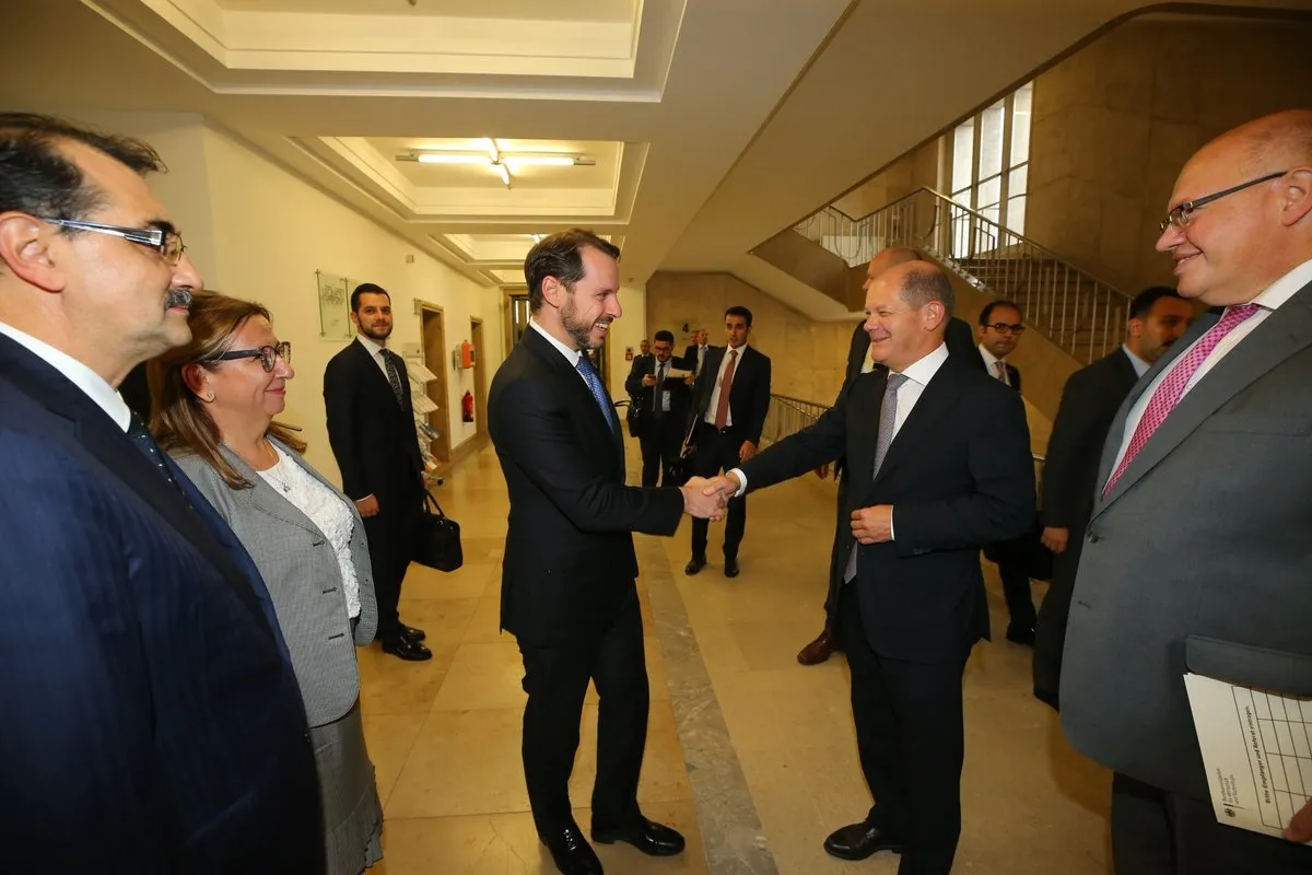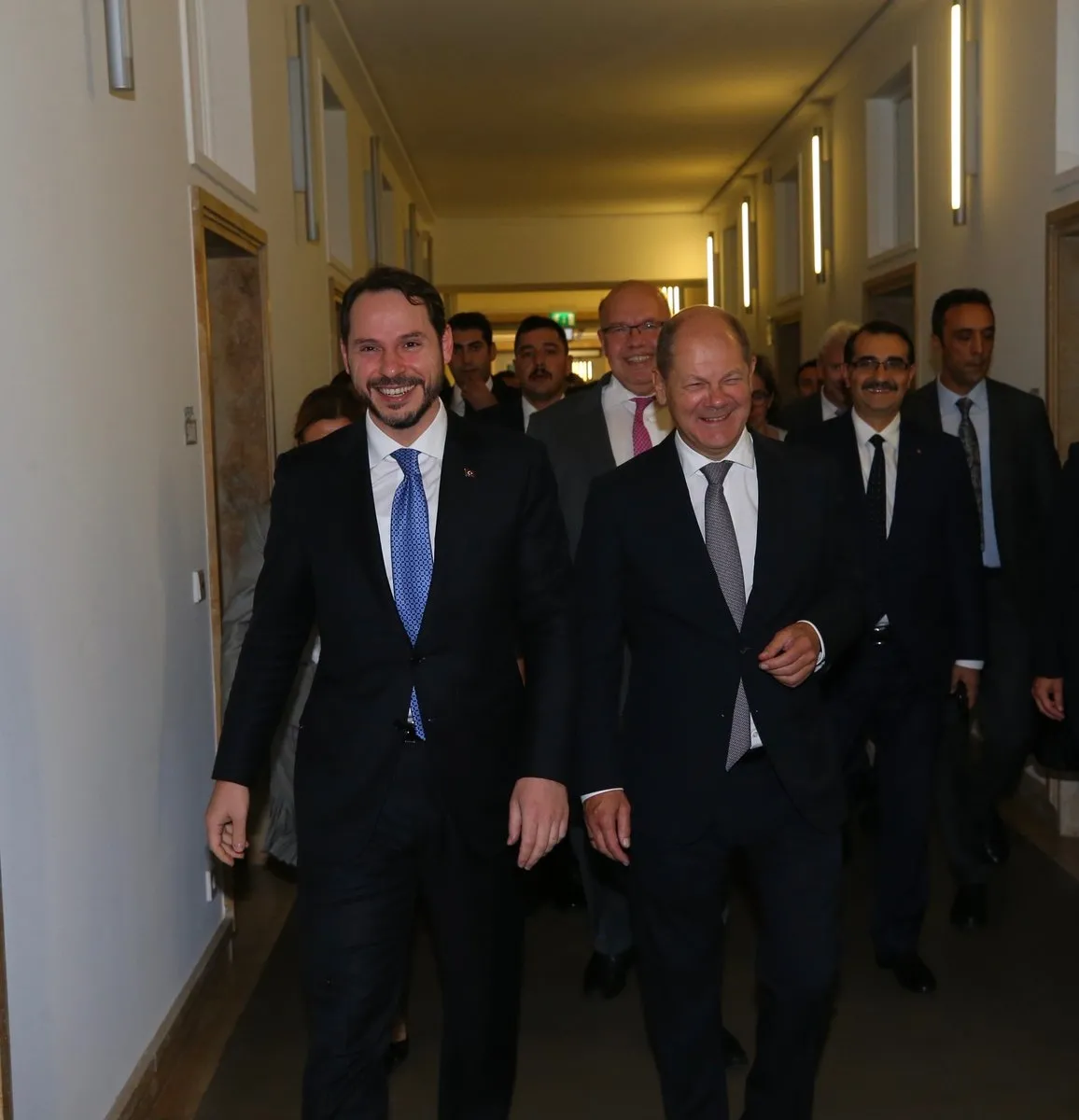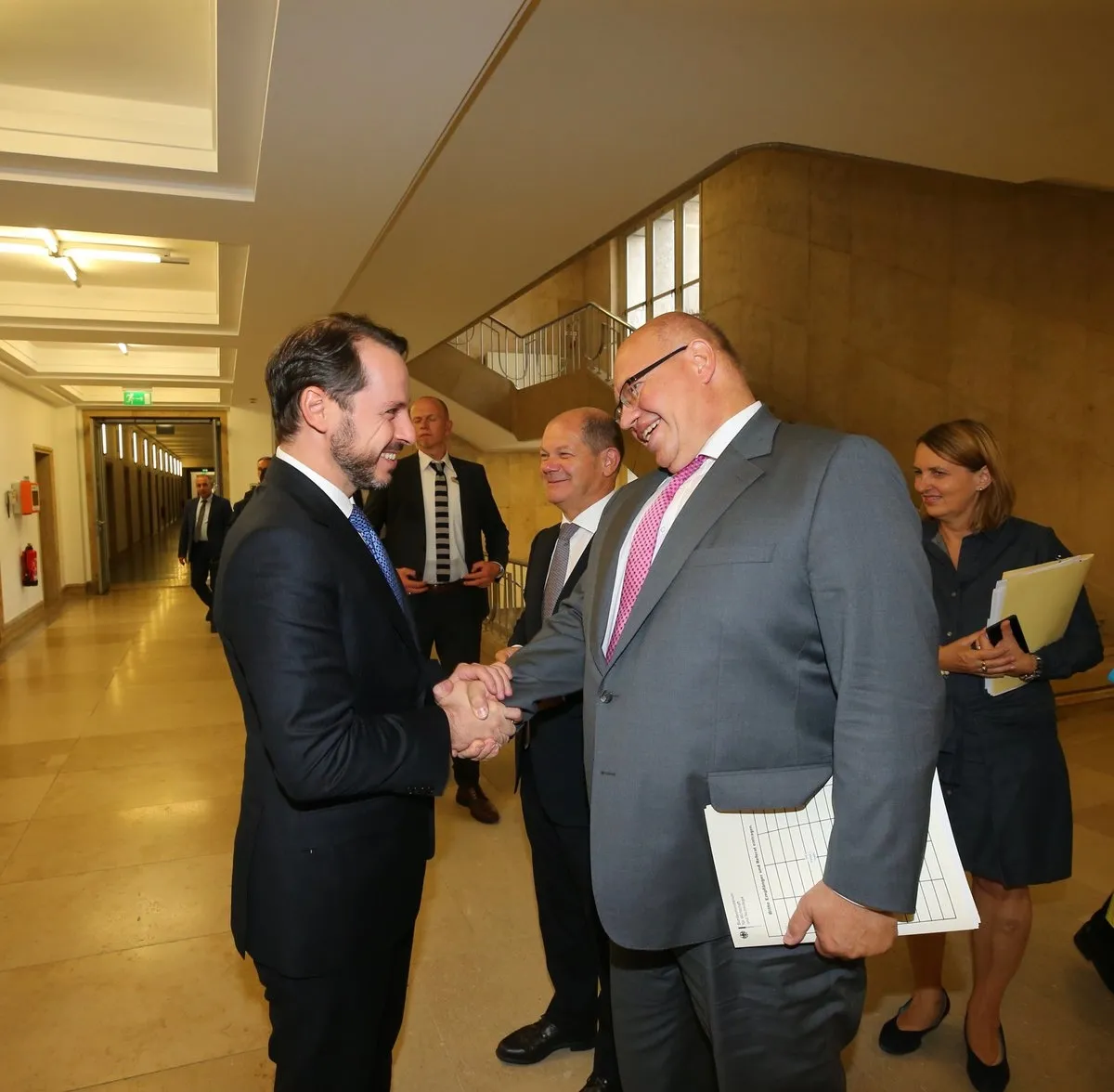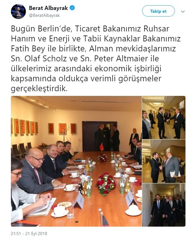 Albayrak: "Bugün Berlin'de, Ticaret Bakanımız Ruhsar Hanım ve Enerji ve Tabii Kaynaklar Bakanımız Fatih Bey ile birlikte, Alman mevkidaşlarımız Sn. Olaf Scholz ve Sn. Peter Altmaier ile ülkelerimiz arasındaki ekonomik işbirliği kapsamında oldukça verimli görüşmeler gerçekleştirdik."