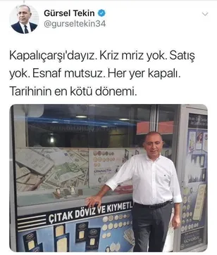 CHP'li Gürsel Tekin, dün cuma namazı vaktinde gittiği Kapalıçarşı'da ibadetini yapmak için dükkanını kapatan esnafın dükkanı önünde çekildiği fotoğraf ile "kriz edebiyatı" yaptı. Kriz nedeniyle Kapalıçarşı'da bile esnafın kan ağladığını iddia eden Tekin'e cevap çok geçmeden Kapalıçarşı esnafından geldi.
