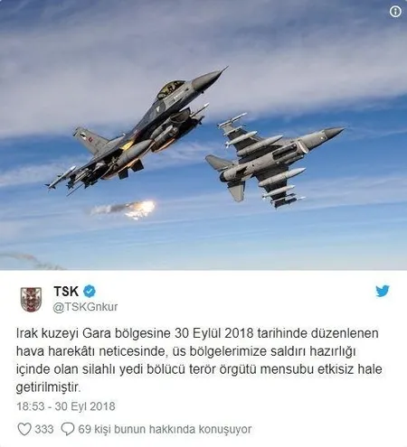 Irak kuzeyi Gara bölgesine düzenlenen hava harekatında, saldırı hazırlığı içinde olan 7 terörist etkisiz hale getirildi.