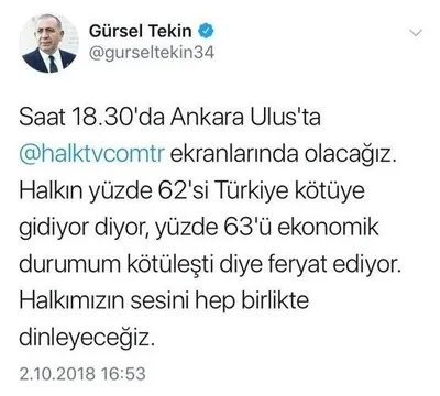 Sosyal medyadaki oyunlarıyla halkı kriz bahanesiyle ümitsizliğe taşımak isteyen CHP Genel Sekreteri Gürsel Tekin yine çuvalladı. İstanbul Kapalıçarşı'da cuma namazına giden esnafın kriz nedeniyle dükkanını kapattığı yalanını ortaya atan ve bu senaryosu bizzat dükkan sahibi tarafından çürütülen Tekin, bin bir kurgu ve kurnazlıkla gittiği Ankara Ulus Hali'nden de eli boş döndü. Tekin, vatandaştan beklediği karşılığı ve desteği bulamayınca halkı sosyal medyadan attığı tweetlerle kandırmaya çalıştı.