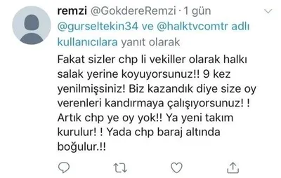 Tekin'in tweetine karşılık ise gecikmedi. Tepki gösteren vatandaşlar "Hâlâ fikrinizin meyvelerinden zehirlendiğimiz günleri unutmadık", "Hiçbir yol haritanız yok. Yaptığınız tek şey eleştiri. Artık CHP'ye oy yok" şeklinde tweetler atıldı.