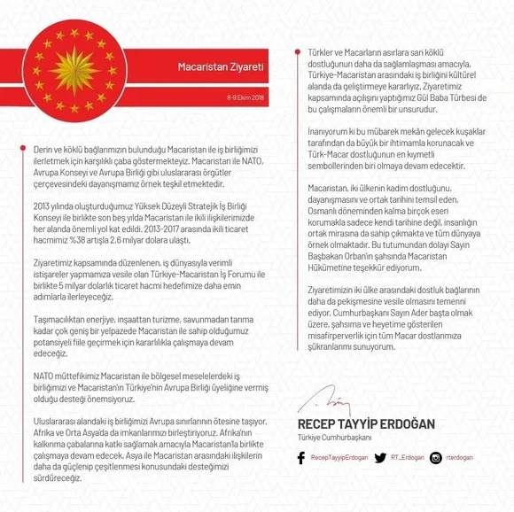 Başkan Erdoğan, kendi imzasını taşıyan "Macaristan Ziyareti" başlıklı bir değerlendirme yazısını sosyal medya hesabından paylaştı.