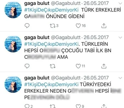 Attığı skandal mesajlar ve çektiği iğrenç videoların yanı sıra Gaga Bulut'un Türklüğe hakaret eden ve Türk düşmanlığı içeren tweetleri de bulunuyor. Gaga Bulut "Türkler kadar kanı bozuk pis bir millet yok" diyerek Türklüğü aşağılamaya da çalışmıştı..