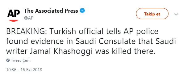 Associated Press (AP) haber ajansı, 'kayıp' Suudi gazeteci Cemal Kaşıkçı'nın Suudi Arabistan konsolosluğunda öldürüldüğüne dair polisin kanıt bulduğunu duyurdu.