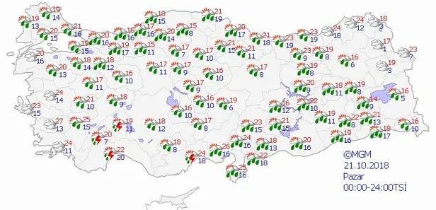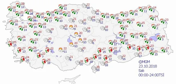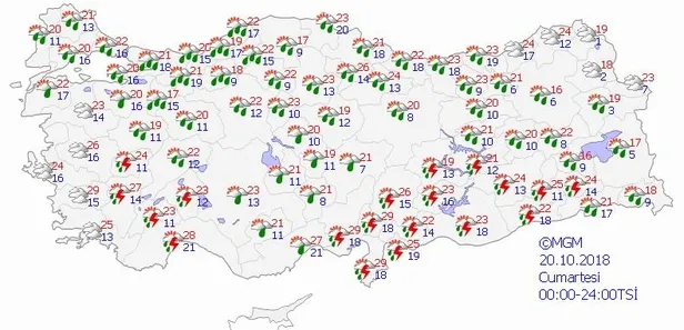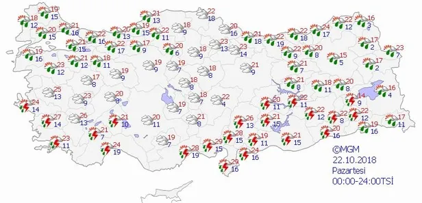 Meteoroloji Genel Müdürlüğü tarafından yapılan son değerlendirmelere göre; yurt genelinin parçalı ve çok bulutlu, Akdeniz'in iç kesimleri, İç Anadolu'nun batısı, Batı Karadeniz, Doğu Anadolu'nun güneyi ve batısı, Güneydoğu Anadolu'nun kuzeyi ve doğusu ile Kocaeli, Sakarya, Bilecik, Kütahya, Afyonkarahisar, Niğde, Kayseri, Çankırı, Gümüşhane, Bayburt, Erzincan ve Bingöl çevrelerinin sağanak ve yer yer gök gürültülü sağanak yağışlı geçeceği tahmin ediliyor. Doğu Akdeniz, İç Anadolu'nun doğusu, Orta Karadeniz'in iç kesimleri, Doğu Anadolu'nun batısı ve Güneydoğu Anadolu bölgelerinde toz taşınımı ile birlikte, Marmara'nın güney ve doğusu, Kuzey Ege'nin iç kesimleri, Batı Karadeniz ile Orta Karadeniz kıyı kesimlerinde yer yer sis ve pus hadisesi bekleniyor.