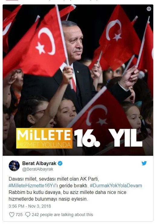 Hazine ve Maliye Bakanı Berat Albayrak AK Parti'nin iktidarının 16. yıldönümü dolayısıyla sosyal medya hesabı Twitter'dan mesaj yayımladı.