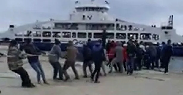 Çanakkale'de, Kabatepe-Gökçeada seferini gerçekleştiren 57. Alay Feribotu, meydana gelen makine arızası nedeniyle Kuzu Limanı'na halat yardımıyla yanaştı. Gemiye atılan halat, iskeledeki demire bağlanmak için vatandaşların yardımıyla çekilirken, ortaya ilginç görüntüler çıktı.