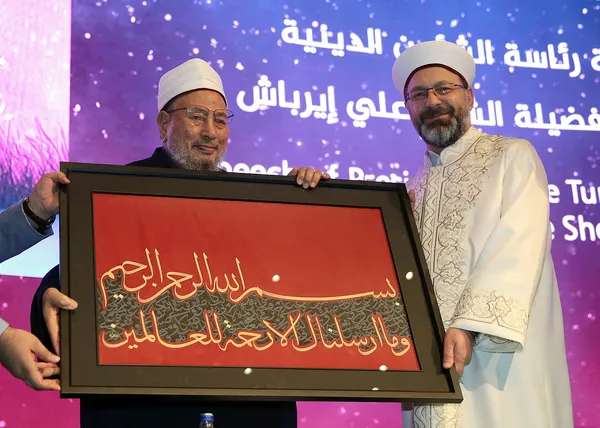 Diyanet İşleri Başkanı Prof. Dr. Ali Erbaş (sağda) ile Dünya Müslüman Alimler Birliği Başkanı Yusuf Karadavi (solda), Dünya Müslüman Alimler Birliği Genel Kurulu'na katıldı. Erbaş, Karadavi'ye üzerinde besmele olan hat tablo hediye etti.