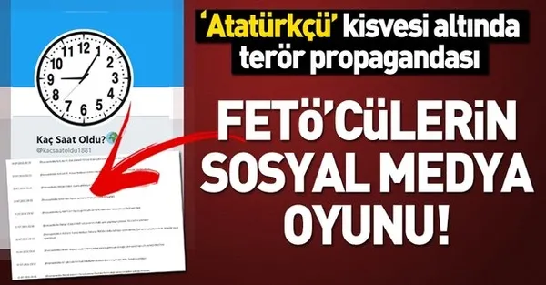 Kendilerini farklı kimliklerin altına gizleyerek sosyal medya platformlarında Fetullahçı Terör Örgütü (FETÖ) propagandası yapan hesapların gerçek yüzleri ortaya çıkmaya devam ediyor. ‘Atatürkçülük’ kisvesi altında FETÖ’yü savunan ‘Kaç Saat Oldu’ (kacsaatoldu1881) isimli Twitter hesabının Türkiye Cumhuriyeti aleyhindeki tüm çalışmaları deşifre edildi.