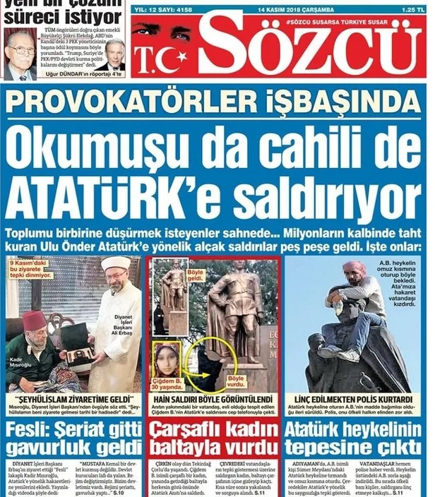 İlköğretim de öğrenci andı okunmaması kararına karşı Danıştay'ın verdiği skandal karar ile başlayan Edirne'de üniversite öğrencisi Emine Şahin'e atfedilen "Atatürk ilah değildir" provokasyonu ve dün Tekirdağ'da kimliği meçhul çarşaflı bir kadının balta ile Atatürk heykeline saldırmasıyla devam eden sistematik provokasyonlar zinciri amacına ulaşamadan deşifre edildi.