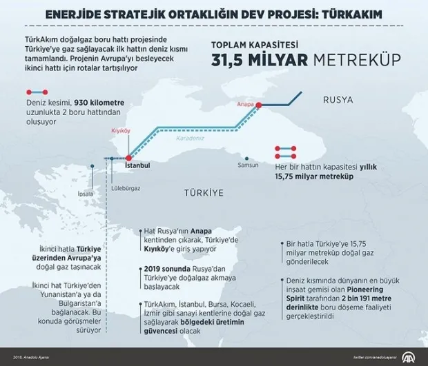 Hat Rusya'nın Anapa kentinden çıkarak Türkiye'de Kıyıköy'e giriş yapıyor. 2019 sonunuda Rusya'dan Türkiye'ye doğalgaz akmaya başlayacak. TürkAkım, İstanbul, Bursa, Kocaeli, İzmir gibi sanayi kentlerine doğal gaz sağlayarak bölgedeki üretimin güvencesi olacak.
