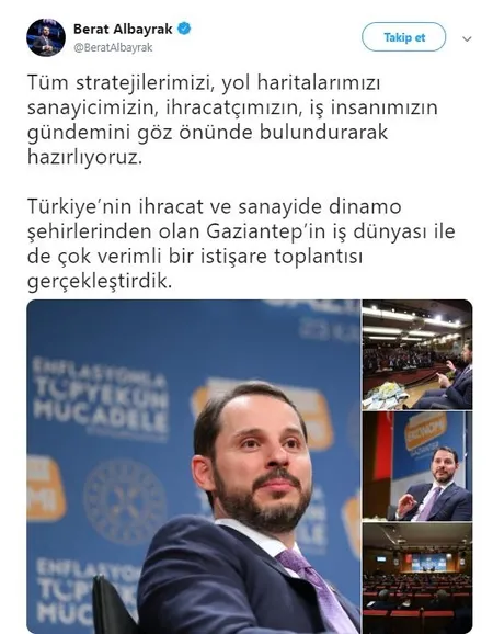 "Tüm stratejilerimizi, yol haritalarımızı sanayicimizin, ihracatçımızın, iş insanımızın gündemini göz önünde bulundurarak hazırlıyoruz. Türkiye'nin ihracat ve sanayide dinamo şehirlerinden olan Gaziantep'in iş dünyası ile de çok verimli bir istişare toplantısı gerçekleştirdik."