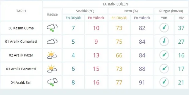 İstanbul için 5 günlük hava durumu raporu yayınlayan Meteoroloji'den yapılan açıklamaya göre, bugün saat 18.00'e kadar kuvvetli yağış etkili olacak. Hava sıcaklığının bugün en yüksek 10 en düşük 7 derece olacağı İstanbul'da gece saatlerine kadar etkisini sürdürek yağışın 30 Kasım'da devam edeceği bildirildi.