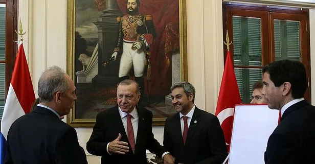Türkiye Cumhurbaşkanı Recep Tayyip Erdoğan, resmi temaslarda bulunmak üzere geldiği Paraguay'da Devlet Başkanı Mario Abdo Benitez ile başkent Asuncion'daki tarihi hükümet binası Lopez Sarayı'nda baş başa görüştü.