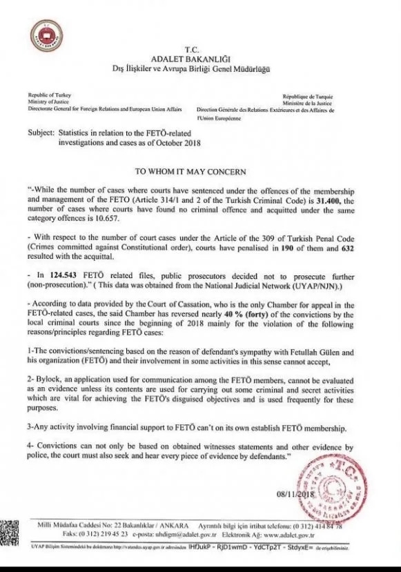 Dış muhataplarımızın (İngiltere yetkili adli mercilerinin) bu çerçevede bilgilendirilmesi için gerekli girişimlerde bulunulmuştur. Londra Adalet Müşaviri hakkında 30 Kasım 2018 itibarıyla inceleme başlatılmış ve ilgili aynı tarihte Ankara'ya çağrılmıştır."