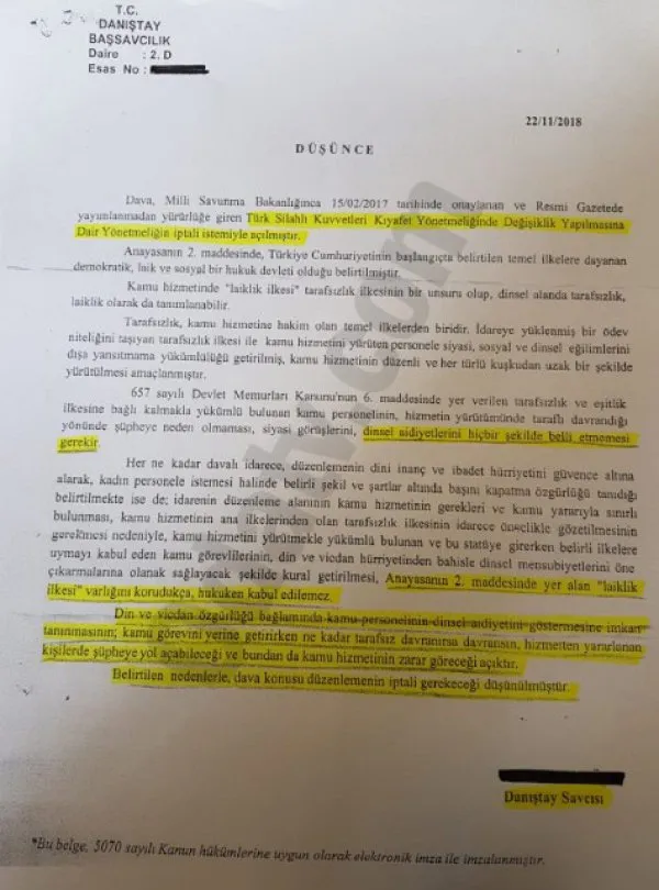 Danıştay savcısı da Halkın Kurtuluş Partisi gibi meşruiyeti tartışılır siyasi mikser oluşumun başvurusunu anında ciddiye alıp, TSK'da başörtüsü serbestliğinin anayasada yer alan laiklik ilkesine aykırı olduğunu söyleyerek düzenlemenin iptal edilmesi gerektiğini savundu.