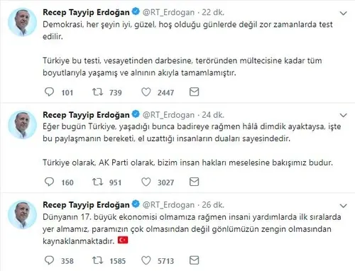 Başkan Erdoğan yaptığı paylaşımda "10 Aralık Dünya İnsan Hakları Günü'nün tüm insanlığa hayırlar getirmesini temenni ediyor, bu vesileyle dünyadaki mazlum ve mağdurlara selamlarımı iletiyorum." dedi.