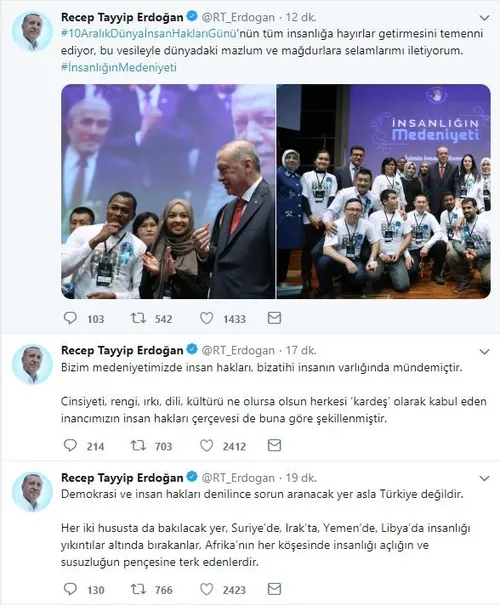 Dünya İnsan Hakları Günü nedeniyle AK Parti Genel Merkezi'nde düzenlenen 'İnsanlığın Medeniyeti' programda konuşan Başkan Erdoğan, daha sonra Twitter hesabından da yaptığı bir paylaşımla tüm dünyaya insan hakları mesajı verdi.