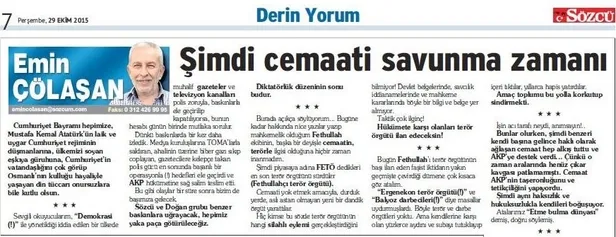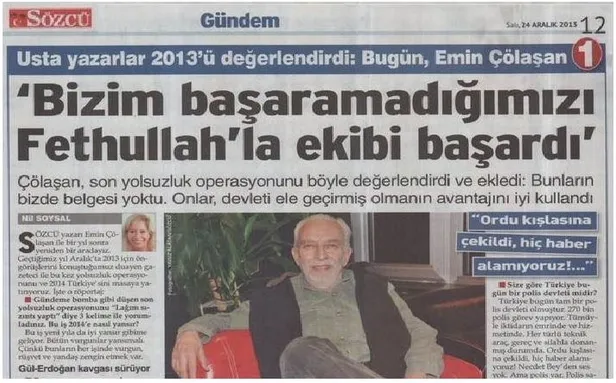 FETÖ'nün medya yapılanması davasında, 15 yıla kadar hapis cezası istenen Emin Çölaşan'ın örgüt propagandası içeren yazıları:
