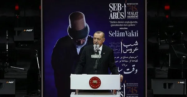 Başkan Recep Tayyip Erdoğan, Konya'da Şeb-i Arus Programı'nda konuştu. "Hz. Mevlana bundan 745 sene önce sonsuzluğun kapılarını araladı." diyen Erdoğan, "Modern dönem haramileri tüm çirkeflikleri ile farklılıklarımızı kaşıyarak şeytani düzenlerini sürdürmeye çalışıyor." ifadelerini kullandı. Konuşmasında Suriye'deki savaştan da bahseden Erdoğan, "1 milyon Müslüman'ın katledildiği Suriye'de, Suriye'nin başındaki zat yerini korumanın gayretini veriyor, birileri de onun yerini korumasına destek veriyor." dedi.