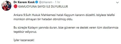 "Ankara 9. Sulh Hukuk Mahkemesi hatalı kayyum kararını düzeltti, böylece telafisi mümkün olmayan bir hatadan dönülmüş oldu. Bu süreçte Kızılay'ın yanında duran, bize güvenen ve destek veren tüm dostlarımıza teşekkür ediyoruz. İyiler kazanacak!"