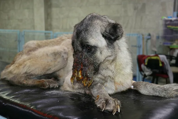 "Köpeğimizin yüzündeki yaranın tek sebebi, yüzüne kimyasal bir madde dökülmesi sonucu oluşmuş. Çünkü tüm dokular zarar görmüş durumda. Kemik ise sağlam. Bu da bize gösteriyor ki yüzüne bir darbe almamış. Yani yavrumuzun yaşadığı şeyler, tamamen insan şiddetinin bir ürünü. Burun bölgesine yanıcı ve yakıcı bir madde dökülmüş."