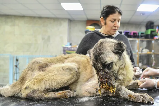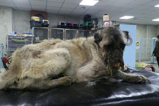Yüzünde yaralar nedeniyle deformasyon oluşan ve 6 aylık olduğu tahmin edilen dişi sokak köpeğinin burun kısmına kezzap benzeri kimyasal madde atıldığı tespit edildi. Tedavisine başlanan ve ağız yoluyla beslenemediği için serum verilen köpeğin vücudundaki enfeksiyon oranının düşürülmesi hedefleniyor.