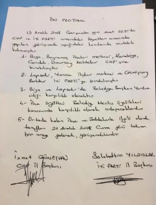 Yerel seçimde ittifak yapma kararı alan CHP ve İyi Parti'nin Çanakkale il başkanları kendi aralarında seçim kanununa aykırı olarak protokol imzaladı. A4 kağıda el yazısıyla hazırlanan protokol metnine TAKVİM ulaştı. CHP Çanakkale İl Başkanı İsmet Güneşhan ve İyi Parti İl Başkanı Selahattin Yıldızlar'ın imzasını taşıyan protokole göre yerel seçimde Biga, Bayramiç ilçeleri ve Karabiga, Çardak, Umurbey beldeleri CHP'ye, Lapseki, Yenice ilçeleri ile Gümüşçay beldesi İyi Parti'ye bırakıldı.
