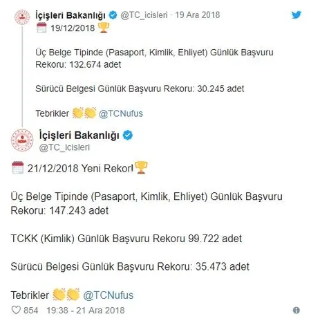 İçişleri Bakanlığının resmi Twitter hesabından, 81 ildeki nüfus müdürlüklerinden yapılan pasaport, kimlik ve sürücü belgesi başvuru sayılarına ilişkin bilgi paylaşıldı.