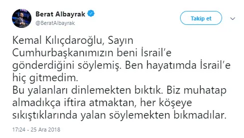 CHP Genel Başkanı Kemal Kılıçdaroğlu'nun bugün CHP Grup Toplantısı'nda Hazine ve Maliye Bakanı Berat Albayrak ile ilgili söylediği İsrail yalanına, Albayrak'tan tokat gibi yanıt geldi. Kılıçdaroğlu grup toplantısında, "Dışarıdan yönetilen bir iktidarla karşı karşıyayız. Yeni bir tezgah kurdular, Netanyahu'ya dediler ki, 'Sen Erdoğan'ı kötüle, o da seni kötülesin. Orada da seçim var, burada da seçim var. Al takke ver külah. Ben İsrail'i, sen de Türkiye'yi kandırırsın.' Bu kibir abidesine sormak isterim; sen bu kadar İsrail'e, Netanyahu'ya kızıyorsan, damadını niye gönderdin İsrail'e? Neyin pazarlığını yapıyor?" ifadelerini kullanmıştı.