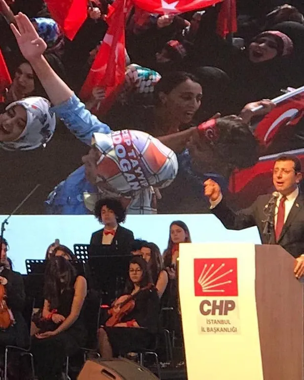 İstanbul Haliç'te düzenlenen törenle CHP lideri Kemal Kılıçdaroğlu tarafından adaylığı ilan edilen Ekrem İmamoğlu'nun tanıtım toplantısına AK Parti'nin miting fotoğrafları damga vurdu. İmamoğlu'nun konuştuğu sırada arkaya yansıtılan fotoğraflarda, başlarında 'Recep Tayyip Erdoğan' yazan bandanalı vatandaşlar dikkat çekti.