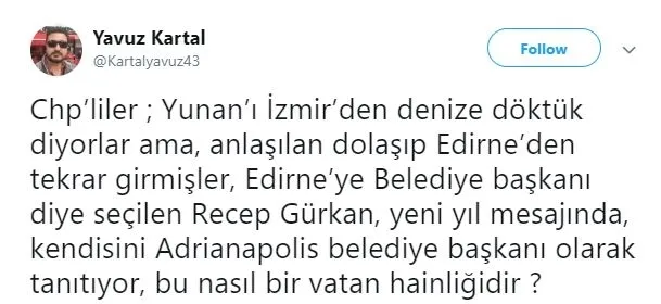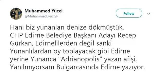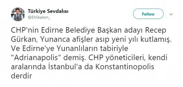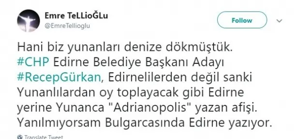 Haber 7'nin haberine göre Gürkan, Yunanca hazırlanan afişte kendisini 'Edirne Belediye Başkanı' yerine şehrin Bizans'taki adı olan 'Adrianapolis belediye başkanı' olarak tanıttı.