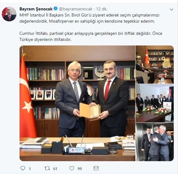 AK Parti İstanbul İl Başkanı Bayram Şenocak, beraberindeki AK Parti İl Teşkilatı heyetiyle birlikte MHP İl Başkanlığını ziyaret etti. Görüşmede, Cumhur ittifakının 31 Mart 2019 Yerel Seçimlerindeki stratejileri hakkında istişare ve değerlendirmelerde bulunuldu. Ziyaret sonrası açıklamalarda bulunan Başkan Şenocak, "Cumhur İttifakı, partisel çıkar anlayışıyla gerçekleşen bir itiffak değildir. Önce Türkiye diyenlerin ittifakıdır." dedi. Şenocak, MHP İstanbul İl Başkanı Birol Gür'e de misafirperver ev sahipliği için teşekkür etti.