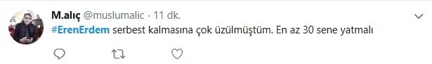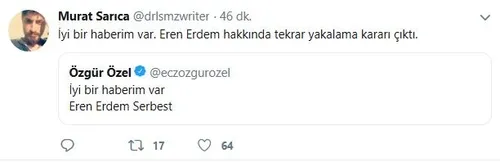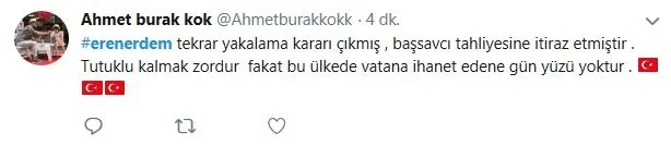 İstanbul Cumhuriyet Başsavcılığı, Eren Erdem hakkında kaçma şüphesi nedeniyle tahliye kararına itiraz etti, itirazı kabul eden üst mahkeme aynı gerekçeyle Eren Erdem hakkında yakalama kararı çıkardı. Kararı sevinçle karşılayan vatandaşlar, sosyal medyadan düşüncelerini böyle dile getirdi.