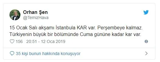 İstanbul Teknik Üniversitesi (İTÜ) Meteoroloji Mühendisliği Bölümü Öğretim Üyesi Prof. Dr. Orhan Şen, Twitter hesabı üzerinden 'kar ne zaman yağacak?' sorularına yanıt verdi. İstanbul için kar yağışı uyarısında bulunan Şen, salı akşamı İstanbul'da kar yağışının etkili olacağını bildirdi. Şen, '15 Ocak Salı akşamı İstanbula KAR var. Perşembeye kalmaz. Türkiye'nin büyük bir bölümünde cuma gününe kadar kar var.' açıklamasında bulundu.