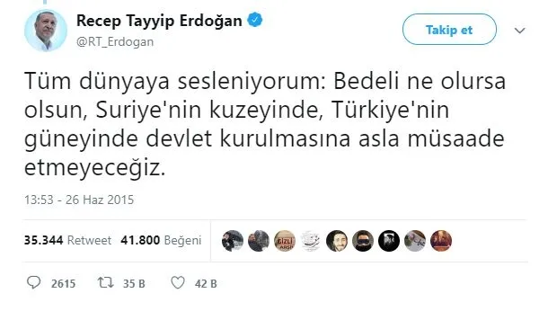 Cumhurbaşkanı Recep Tayyip Erdoğan, 26 Haziran 2015 tarihinde Twitter hesabındaki mesajında, "Tüm dünyaya sesleniyorum; Bedeli ne olursa olsun Suriye'nin kuzeyinde, Türkiye'nin güneyinde devlet kurulmasına asla müsaade etmeyeceğiz" dedi.