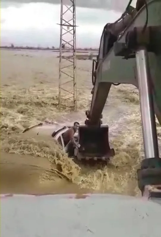Otomobilden çıkan iki kişi kepçeye alınarak kurtarıldı. O anlar ise kepçe operatörü tarafından cep telefonu kamerasıyla görüntülendi.