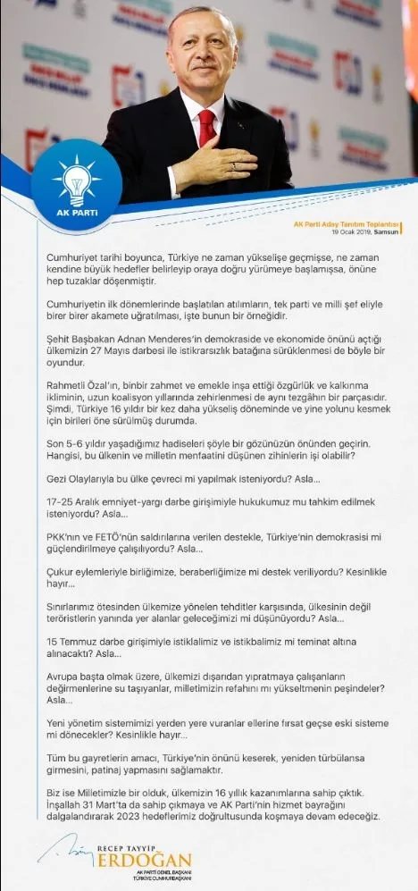 Başkan Erdoğan: "31 Mart’ta milletimizin kazanımlarına sahip çıkmaya ve AK Parti’nin hizmet bayrağını dalgalandırarak 2023 hedeflerimiz doğrultusunda koşmaya devam edeceğiz."