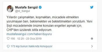 Mustafa Sarıgül, CHP'den istifa etti. Eski Şişli Belediye Başkanı Sarıgül, istifa kararını resmi internet sitesinden duyurdu. Şişli'den aday olduğunu da belirten Sarıgül açıklamasında özetle şu ifadeleri kullandı: