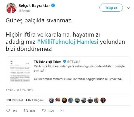 Türkiye Teknoloji Takımı Vakfı'na yönelik İBB tarafından para aktarıldığı yönündeki iddialara Selçuk Bayraktar sosyal medya üzerinden böyle yanıt verdi. Güneş balçıkla sıvanmaz. Hiçbir iftira ve karalama, hayatımızı adadığımız #MilliTeknolojiHamlesi yolundan bizi döndüremez!