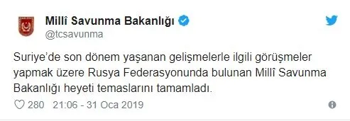 Son dakika gelişmesine göre, Milli Savunma Bakanlığınca (MSB) Twitter üzerindne kritik bir açıklama yapıldı. Twitter hesabından yapılan paylaşımda, Suriye'de son dönemde yaşanan gelişmelerle ilgili görüşmeler yapmak üzere, Rusya Federasyonu'na giden heyetin temaslarını tamamladığı belirtildi.