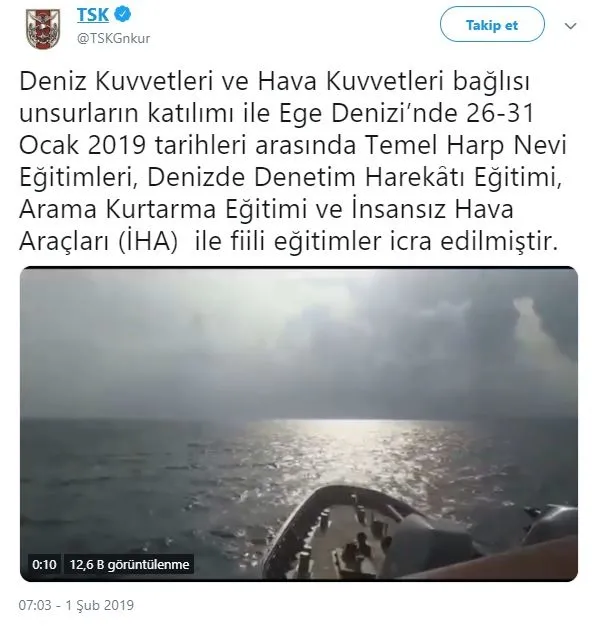 TSK yaptığı paylaşımda, "Deniz Kuvvetleri ve Hava Kuvvetleri bağlısı unsurların katılımı ile Ege Denizi'nde 26-31 Ocak 2019 tarihleri arasında Temel Harp Nevi Eğitimleri, Denizde Denetim Harekatı Eğitimi, Arama Kurtarma Eğitimi ve İnsansız Hava Araçları (İHA) ile fiili eğitimler icra edilmiştir" denildi.