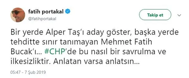 Kamuoyunda CHP'ye desteği ile bilinen Fatih Portakal da Bucak'ın Siverek'ten aday gösterildiğini öğrenince çileden çıktı. Portakal, resmi Twitter hesabından gönderdiği tweette "Bir yerde Alper Taş'ı aday göster, başka yerde tehditte sınır tanımayan Mehmet Fatih Bucak'ı... #CHP'de bu nasıl bir savrulma ve ilkesizliktir. Anlatan varsa anlatsın..." ifadelerini kullandı.