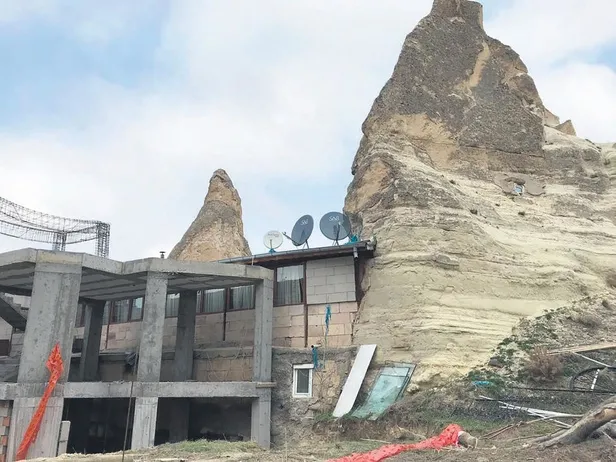 Göreme'de yıkılan inşaatın solundaki otelde peribacalarına kapı bile yapıldı.