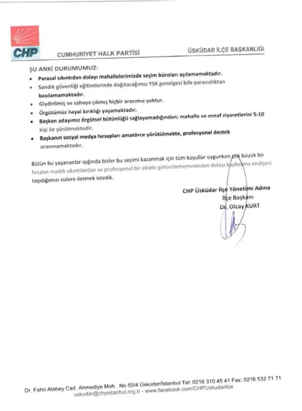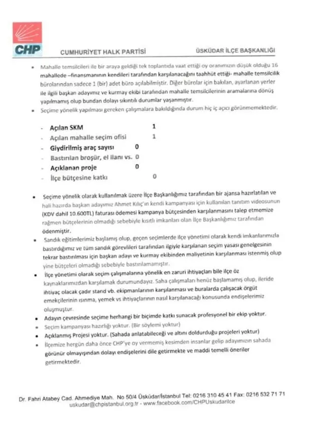 "Şu anki durumumuz: Parasal sıkıntıdan dolayı mahallelerimizde seçim büroları açılamamaktadır. Sandık güvenliği eğitimlerinde dağıtacağımız YSK genelgesi bile parasızlıktan basılamamaktadır. Giydirilmiş veya sahaya çıkmış bir aracımız yoktur. Örgütümüz hayal kırıklığı yaşamaktadır. Başkan adayımız örgütsel bütünlüğü sağlayamadığından; mahalle ve esnaf ziyaretlerini 5-10 kişi ile yürütmektedir. Bütün bu yaşanılanlar ışığında bizler bu seçimi kaybetme endişesi taşıdığımızı sizlere iletmek istedik."