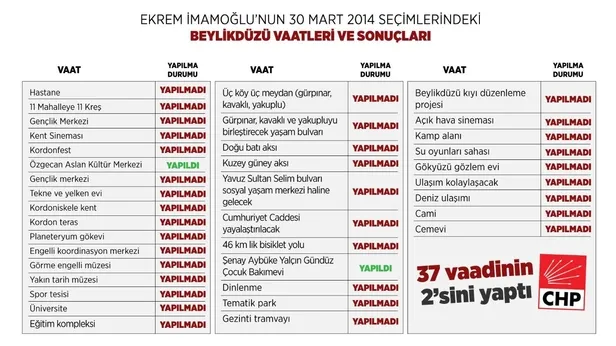 CHP'nin İstanbul adayı Ekrem İmamoğlu, 30 Mart 2014 yerel seçimlerinde Beylikdüzü için 37 vaat açkladı. İmamoğlu, 37 vaatten sadece 2'sini gerçekleştirebildi. Yapılan 2 vaat ise 37'nin en düşük maliyetlileri...
